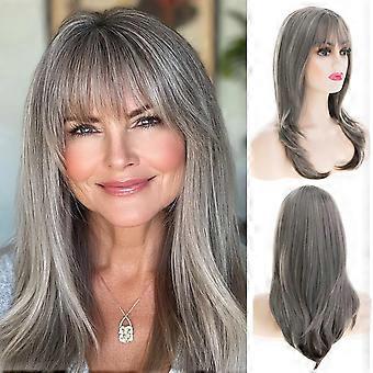 Brown Mixed Grey Long Straight Wig with Bangs, Natural Look Synthetic Hair for Women Daily Party
